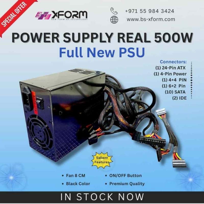 Power Supply Real 500W, Full New PSU, Fan 8 CM, ON/OFF Button, Black Colour, Premium Quality